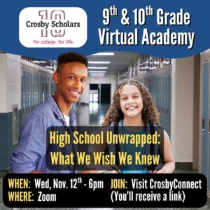 Join us for a real talk panel discussion where our Crosby Scholars juniors and seniors share the valuable lessons they wish they’d learned earlier in 9th and 10th grade. Hear honest insights, practical tips, and words of wisdom from successful upper-class students who’ve been where you are and are now thriving!