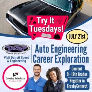 Crosby Scholars encourages students to explore careers and learn about jobs available in the community. Try-It Tuesday is our series of events held during the summer. This session will be hosted by Detroit Speed & Engineering. 20 students can participate and they will learn about jobs available right here in Iredell County.